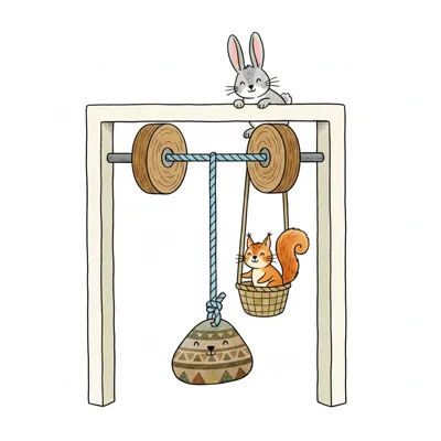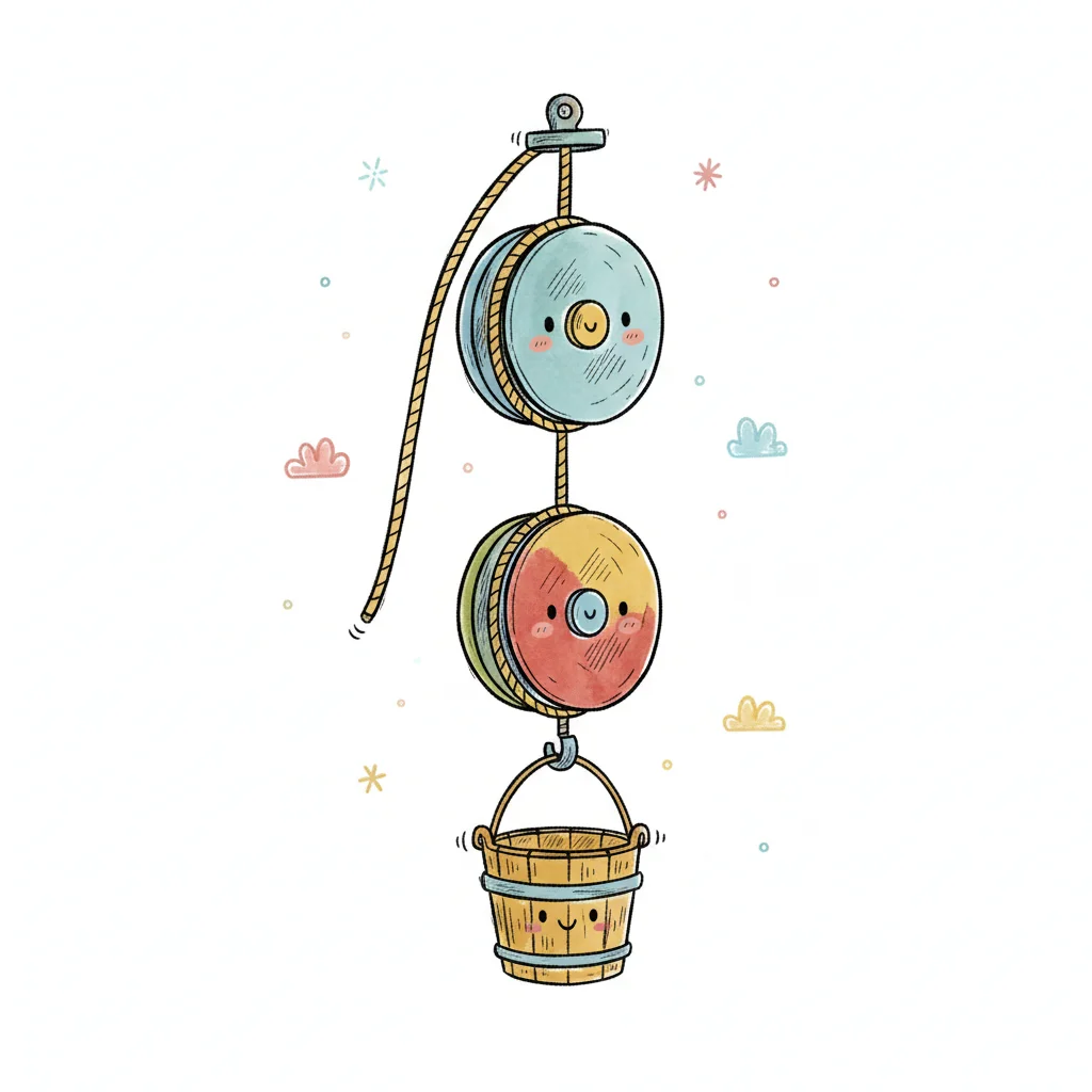 Niedliche Illustration eines Flaschenzugs mit lächelnden Rollen und einem fröhlichen Eimer.