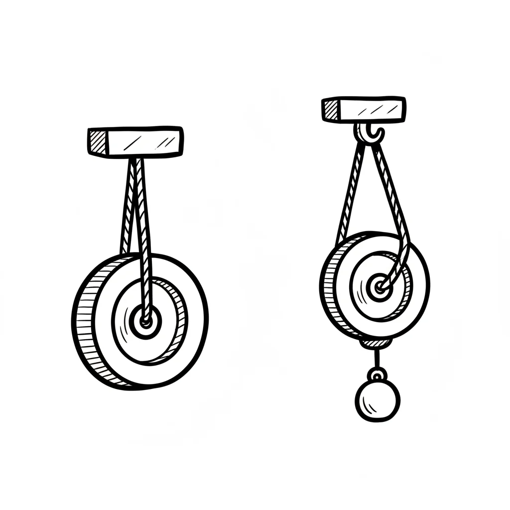 Darstellung von zwei Flaschenzugsystemen: ein fester und ein loser Flaschenzug mit Gewichten.