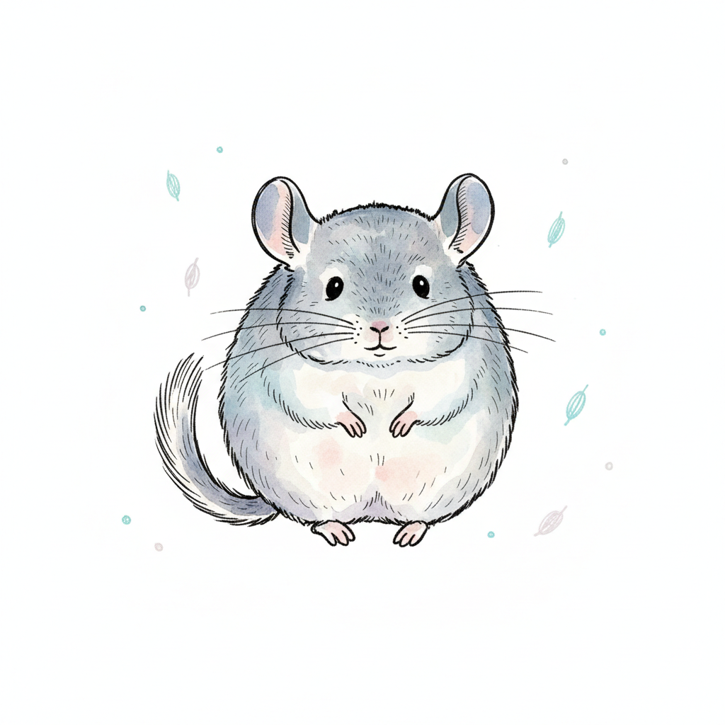 Niedliche, flauschige Chinchilla-Illustration in Grau und Weiß auf weißem Hintergrund.