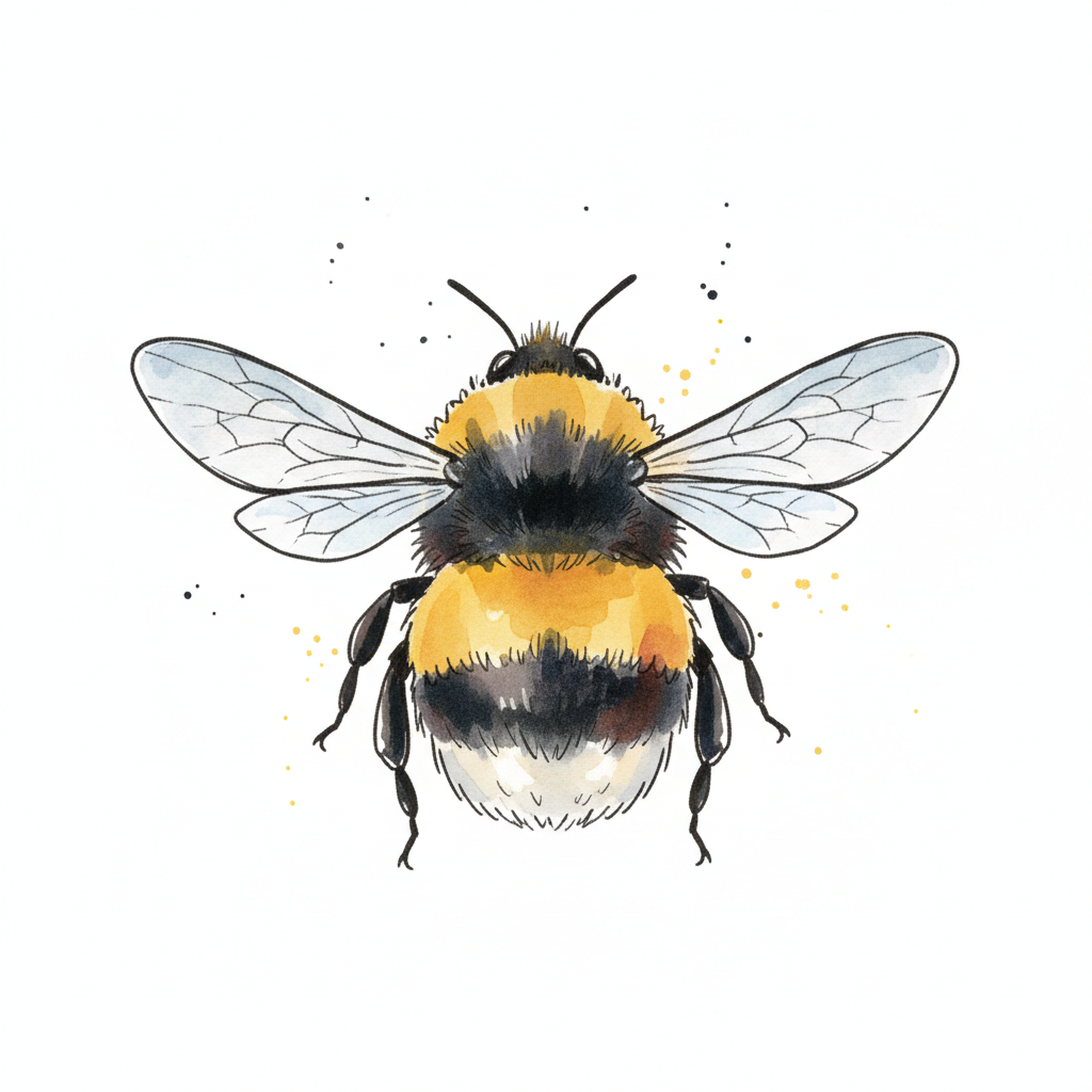 Aquarellzeichnung einer flauschigen Hummel in Schwarz und Gelb auf weißem Hintergrund mit Farbspritzern.
