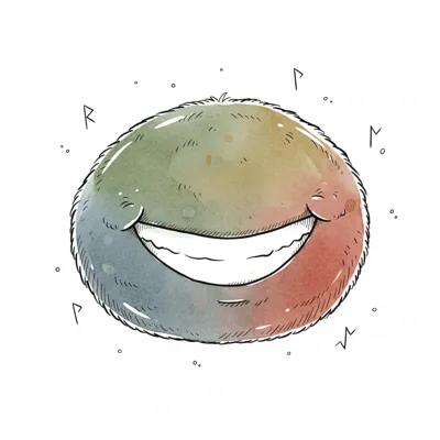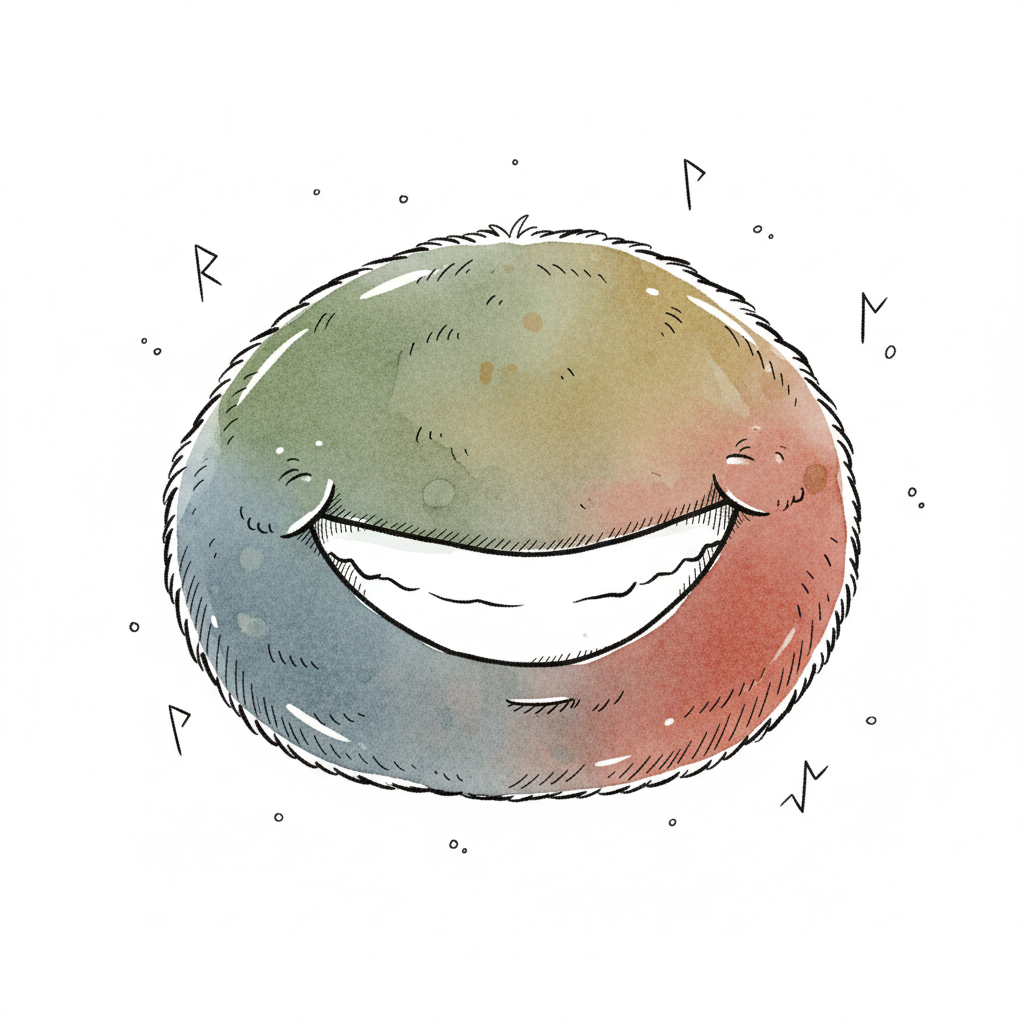 Ein rundes, flauschiges, farbenfrohes Wesen mit einem breiten, fröhlichen Lächeln im Aquarellstil.