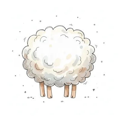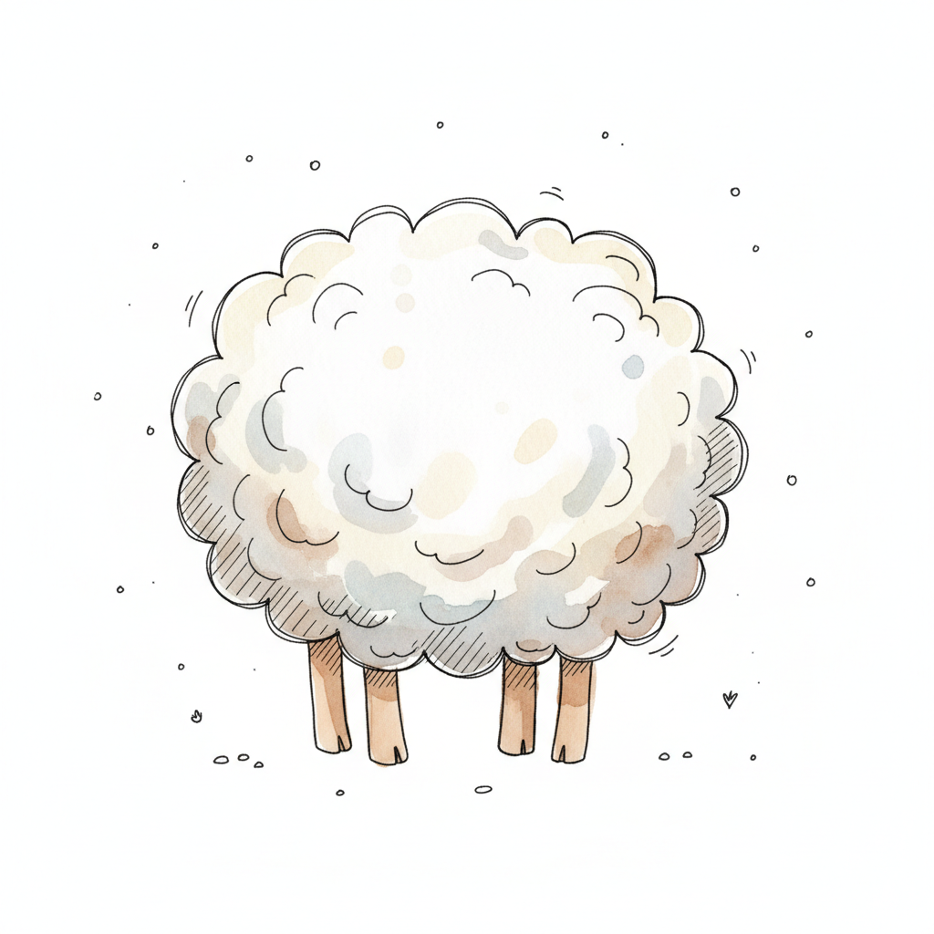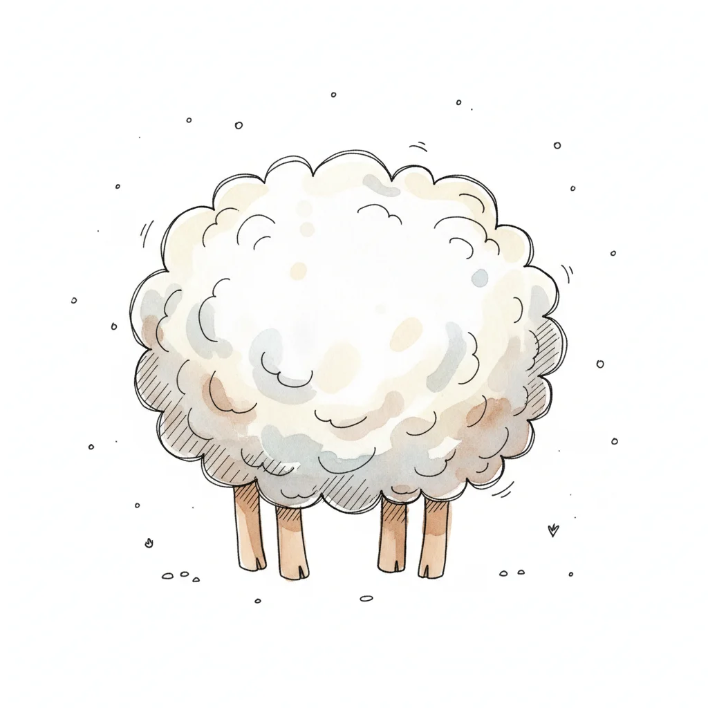 Niedliches, flauschiges Schaf von hinten, mit weißen Wolken und dünnen Beinen, im Cartoon-Stil.
