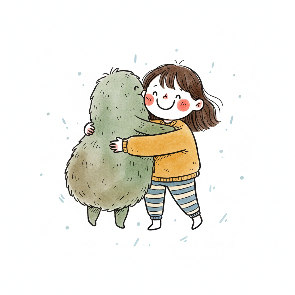 Ein glückliches Mädchen umarmt ein flauschiges grünes Monster in einem niedlichen Cartoon-Stil.