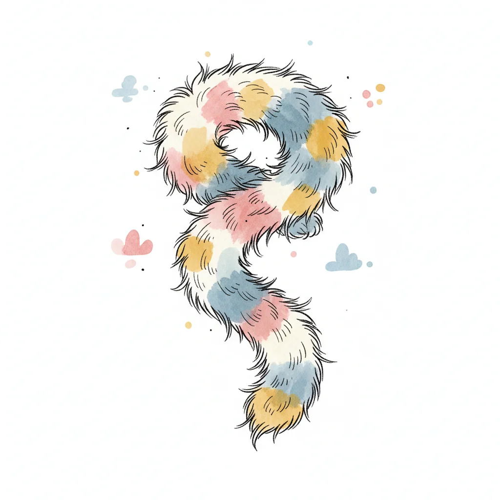 Flauschiger, bunter Schwanz im Aquarellstil, geformt wie ein Fragezeichen.
