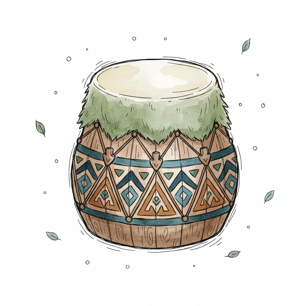 Aquarell-Illustration einer Trommel mit ethnischen Mustern, Holzkorpus und grünem, flauschigem Rand.