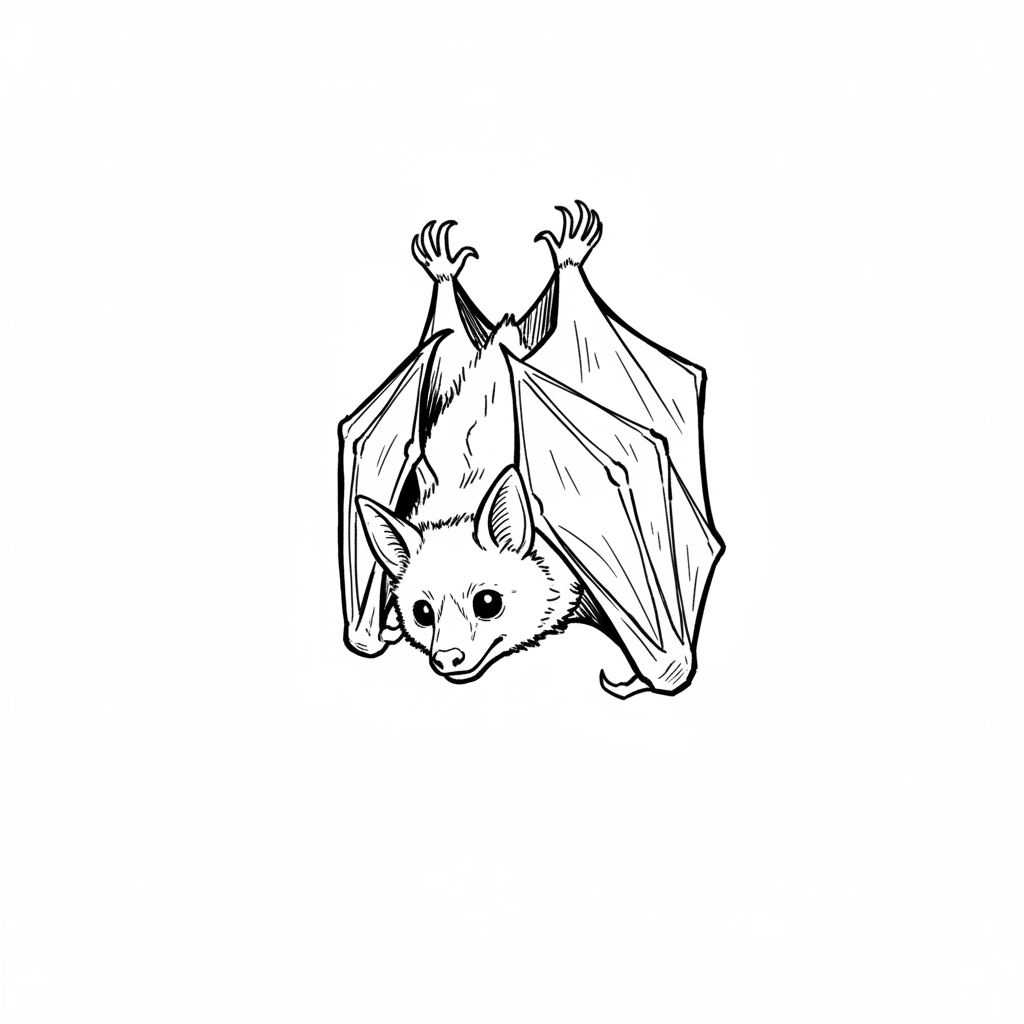 Eine Illustrationszeichnung einer hängenden Fledermaus mit großen Flügeln.