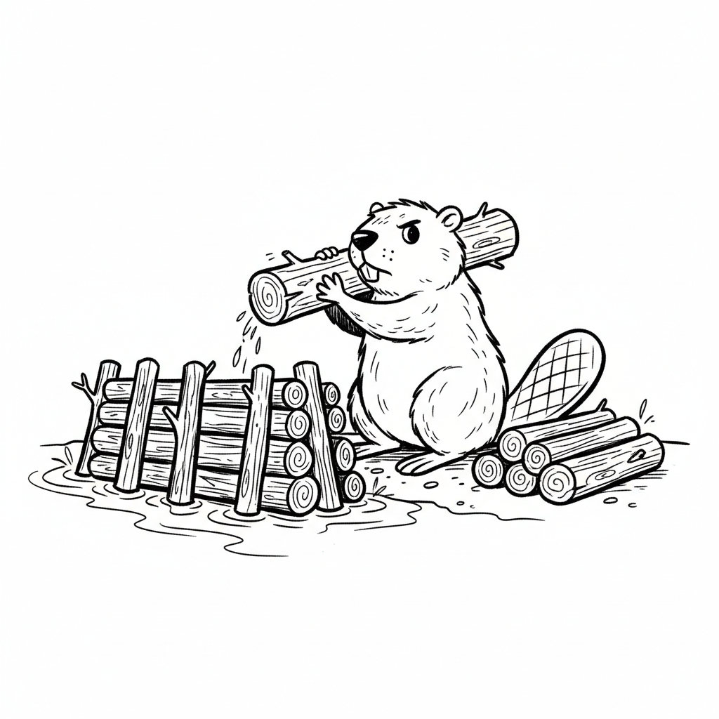 Fleißiger Cartoon-Biber baut einen Damm aus Holzstämmen. Schwarz-weiße Illustration.