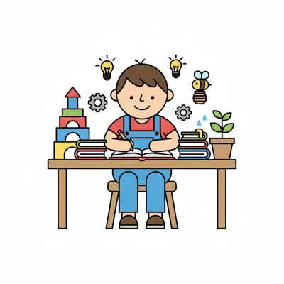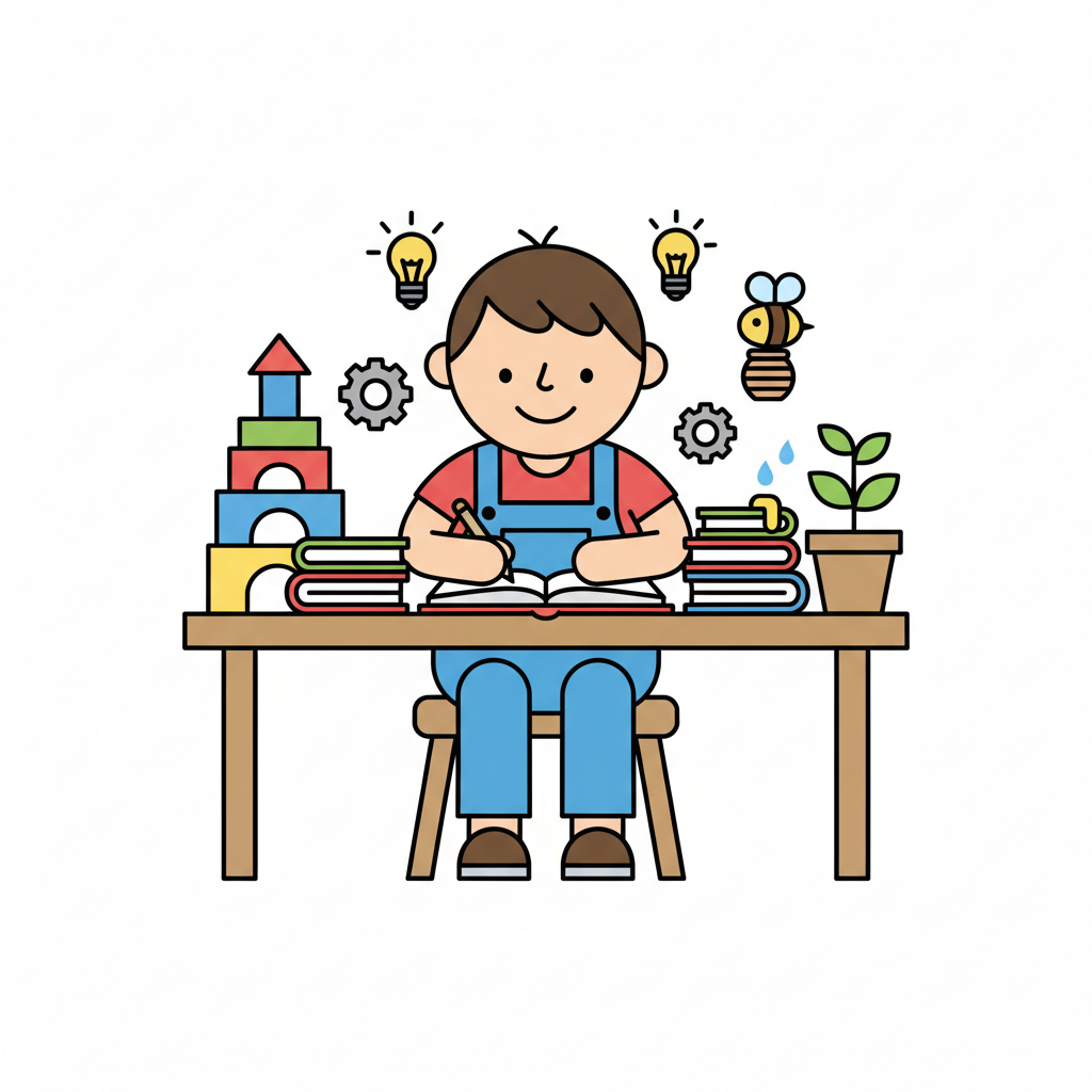 Junge lernt am Schreibtisch, umgeben von Büchern, Spielzeug und Symbolen für Kreativität und Natur.