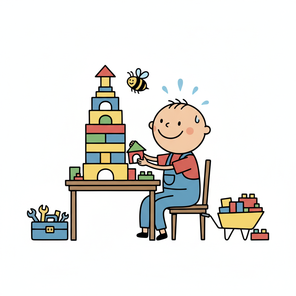 Fröhlicher Junge baut einen hohen Turm aus bunten Bauklötzen, eine Biene fliegt vorbei.