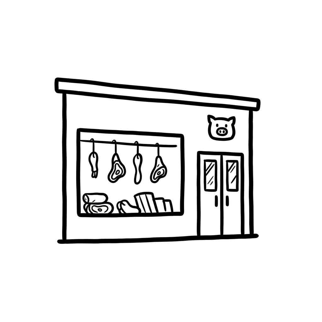 Ein einfaches, skizziertes Metzgergeschäft mit Fleischwaren im Fenster.