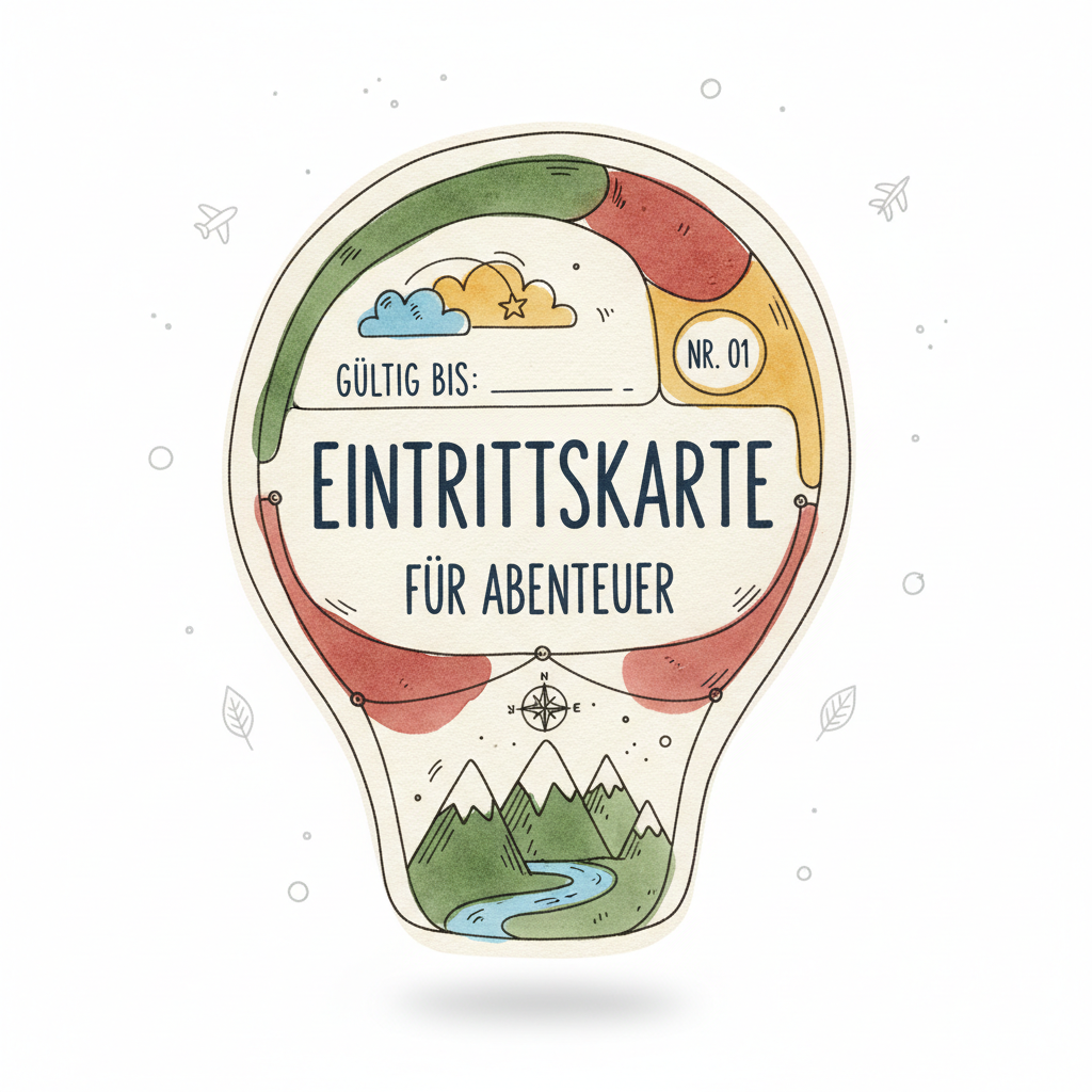 Handgezeichnete Eintrittskarte für Abenteuer in Glühbirnenform mit Bergen, Fluss und Wolken.
