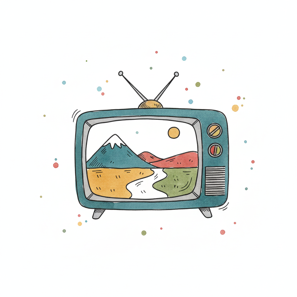 Retro-TV zeigt eine farbenfrohe Landschaft mit Bergen, Fluss und Sonne im Aquarellstil.