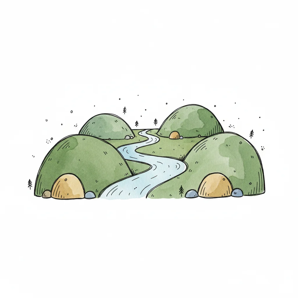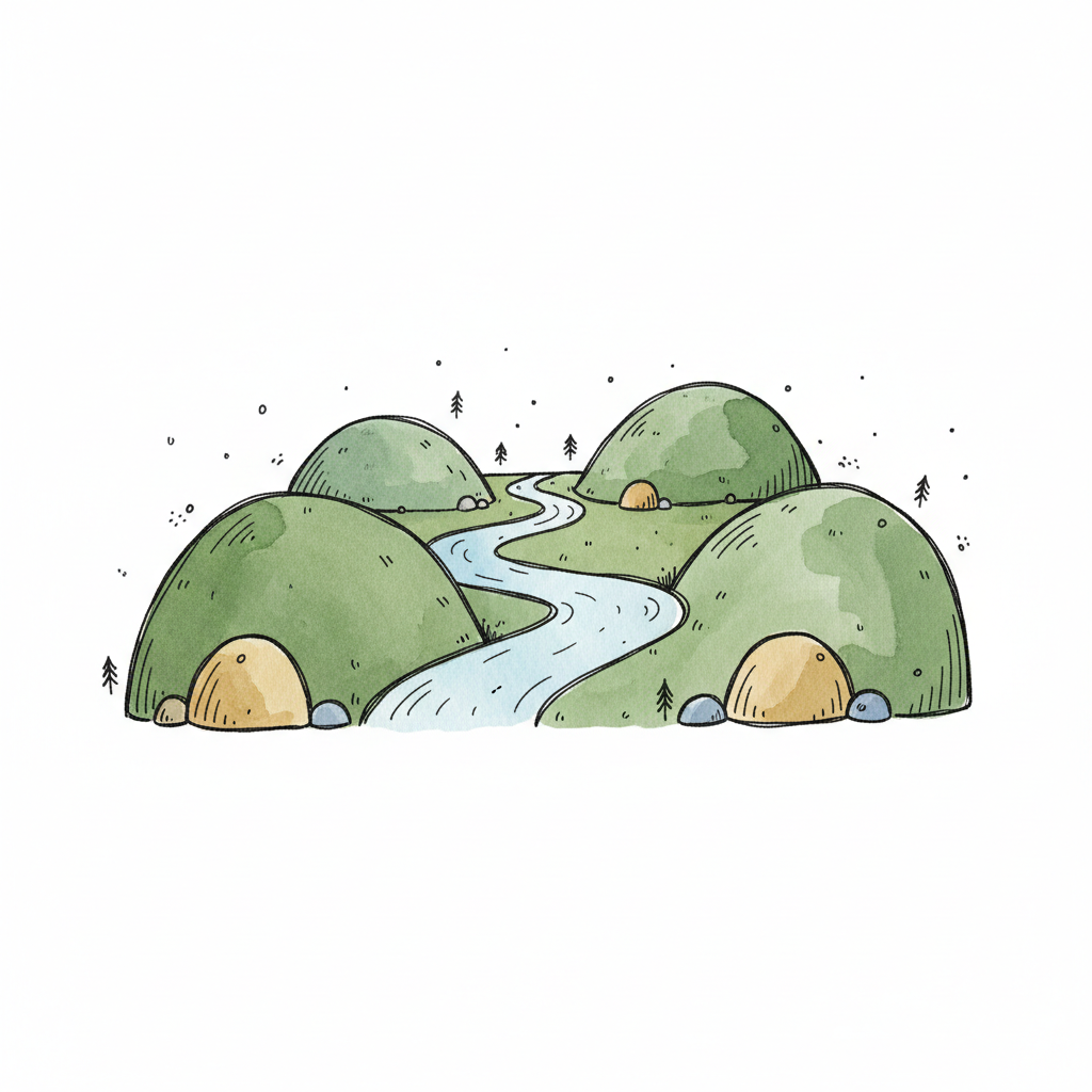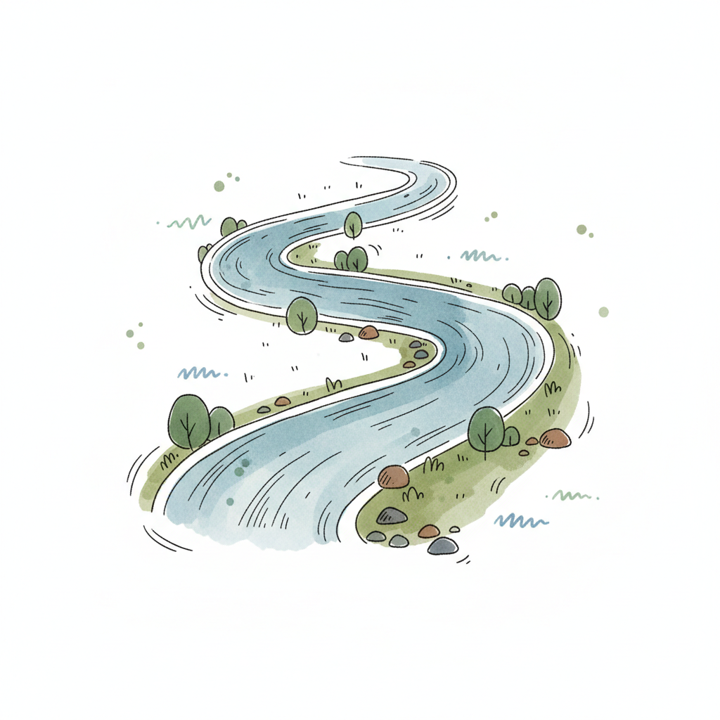 Aquarell-Illustration eines sich schlängelnden Flusses mit grünen Ufern, Bäumen und Steinen.