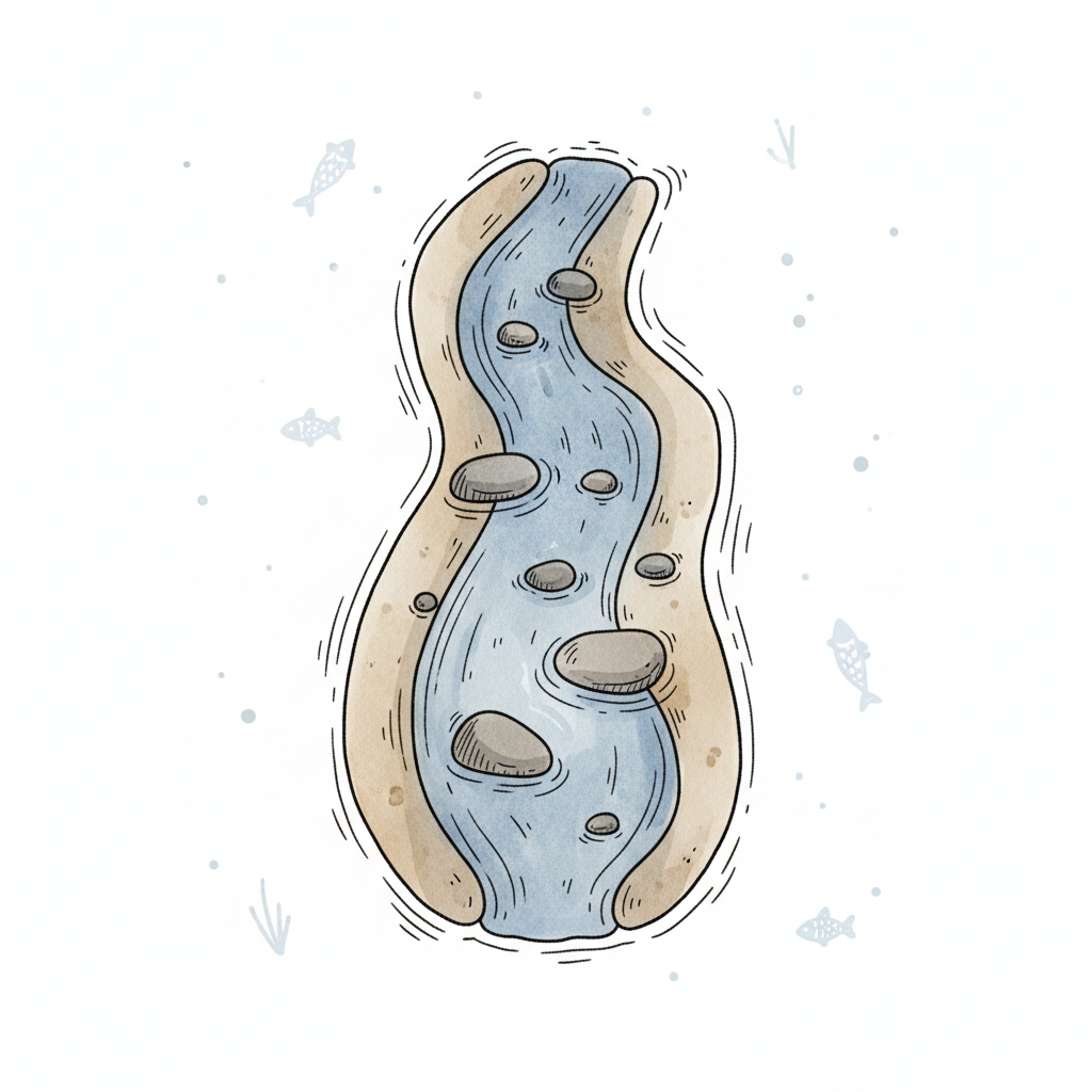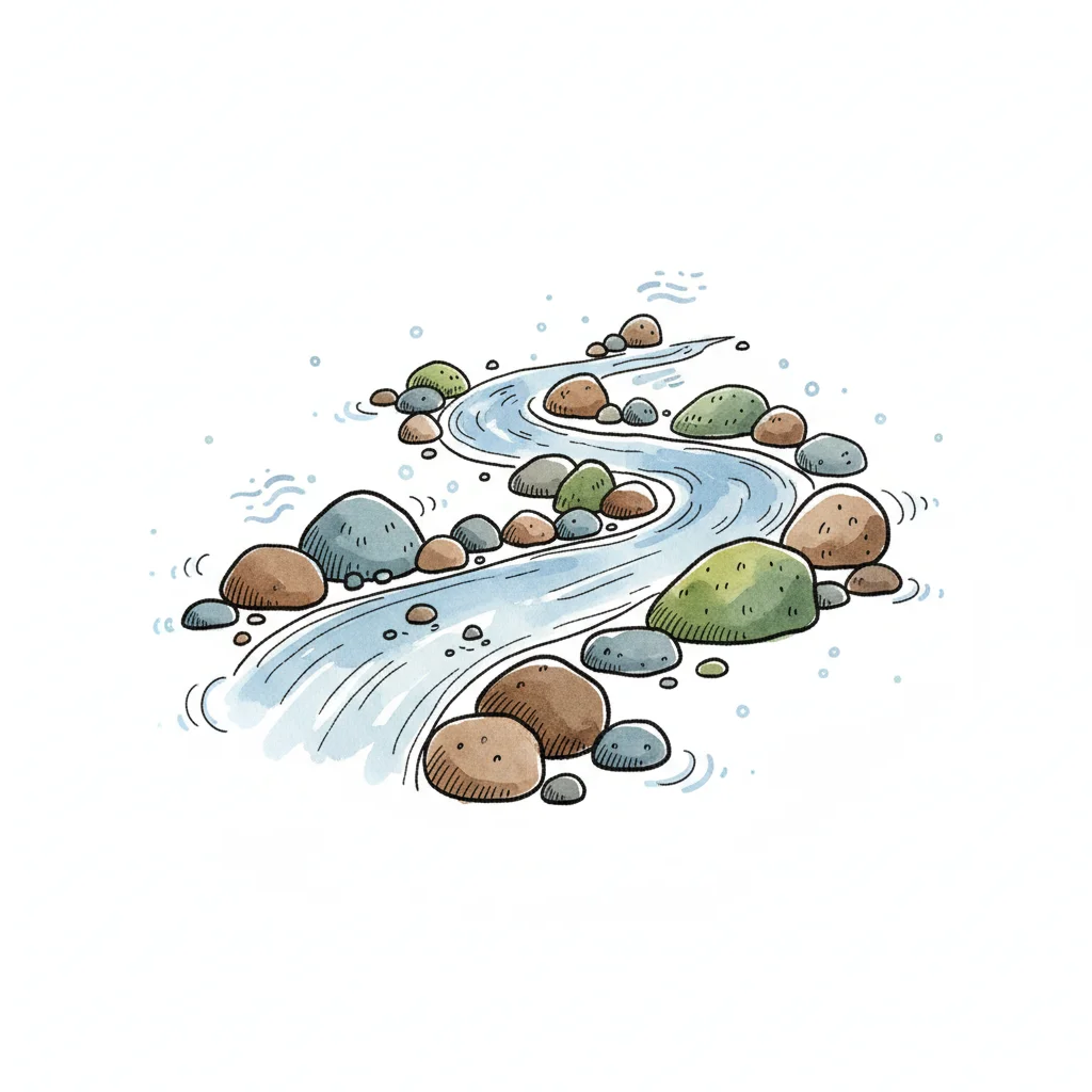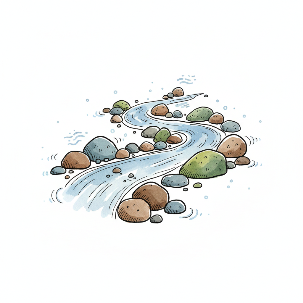 Illustrierter Flusslauf mit Felsen und grünen Pflanzen in klarem Wasser, handgezeichneter Stil.