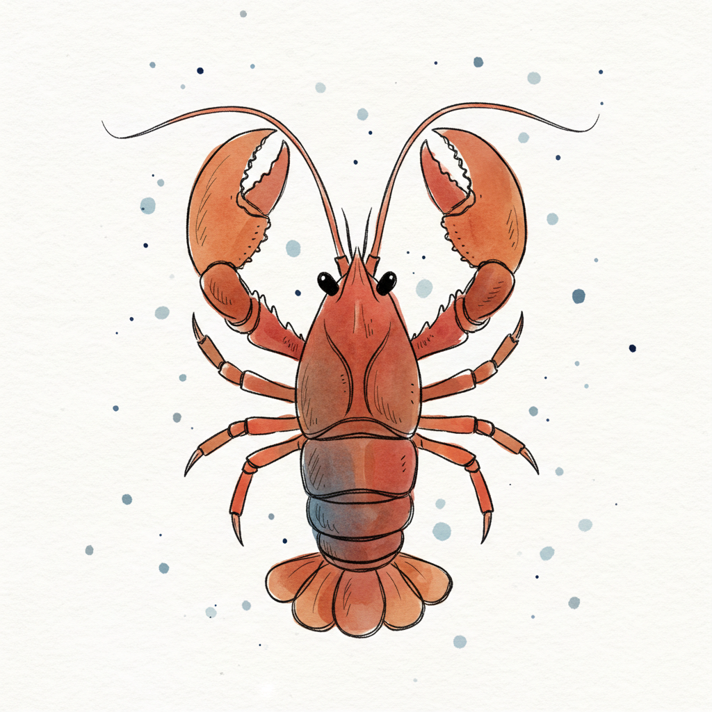 Aquarell-Illustration eines roten Hummers mit großen Scheren auf weißem Hintergrund mit blauen Sprenkeln.