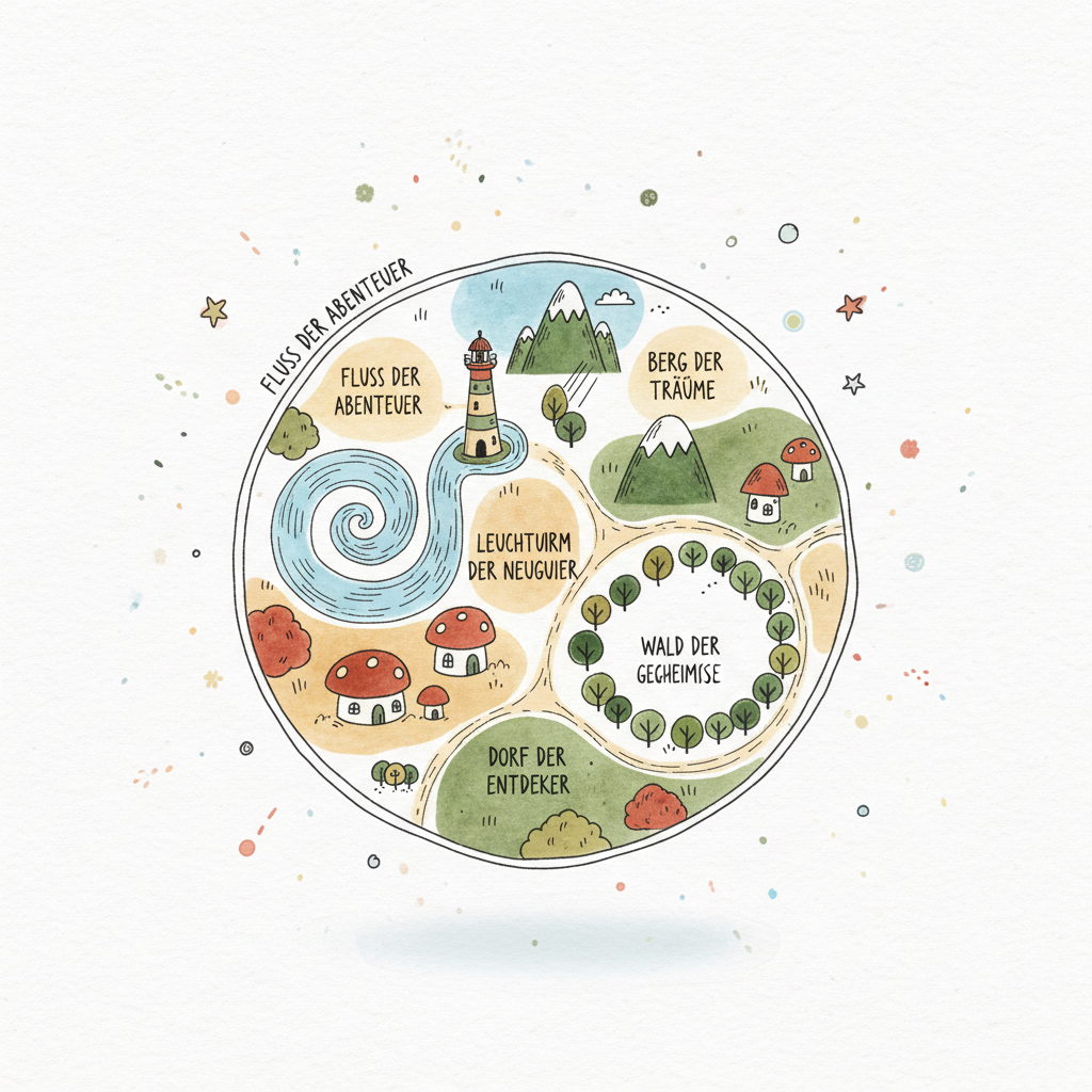 Eine fantasievolle, runde Karte mit Orten wie Fluss der Abenteuer, Berg der Träume und Wald der Geheimnisse.