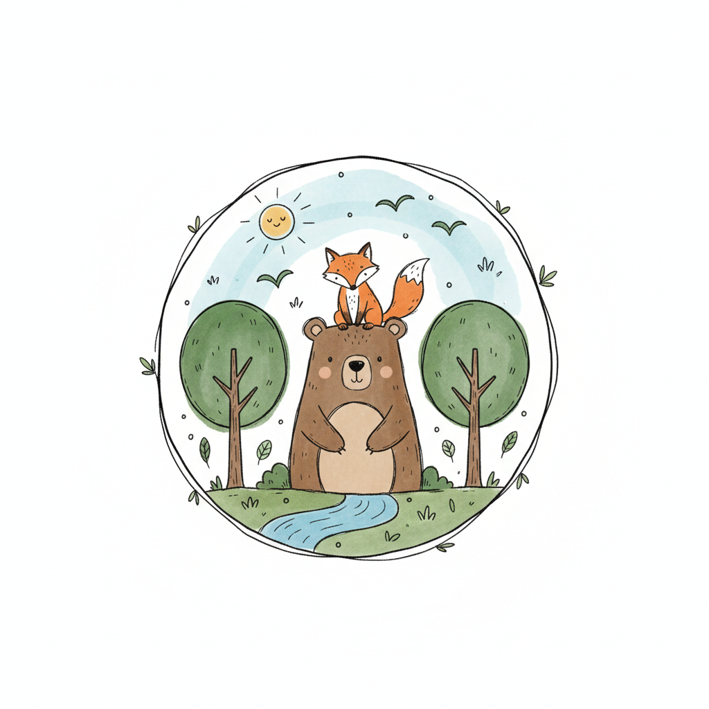 Niedliche Illustration: Fuchs auf Bärenkopf in Waldlandschaft mit Fluss und Sonne.