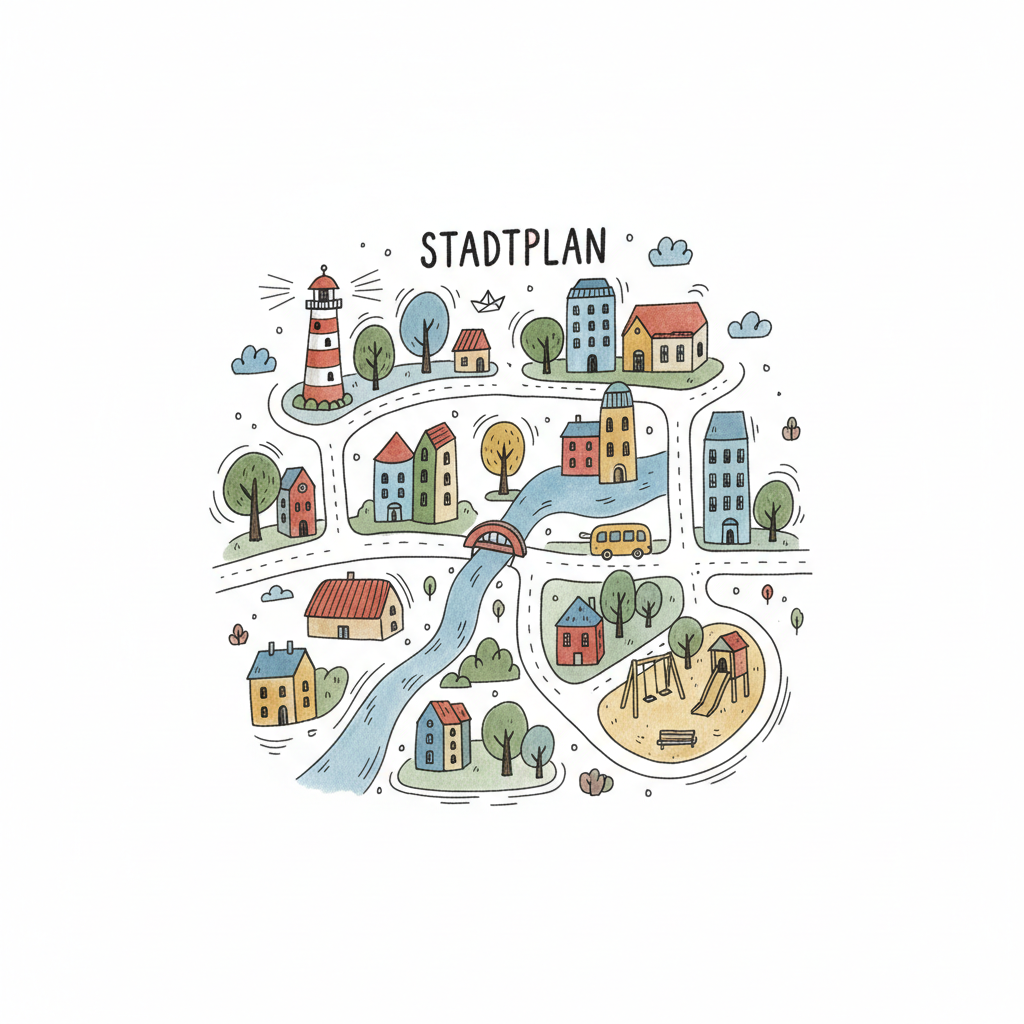 Bunter, handgezeichneter Stadtplan mit Häusern, Fluss, Leuchtturm, Straßen und Spielplatz.