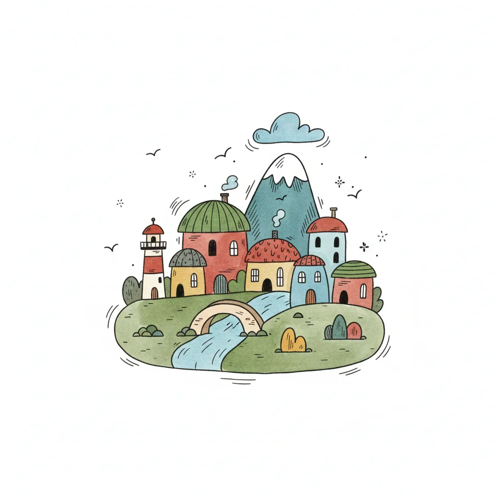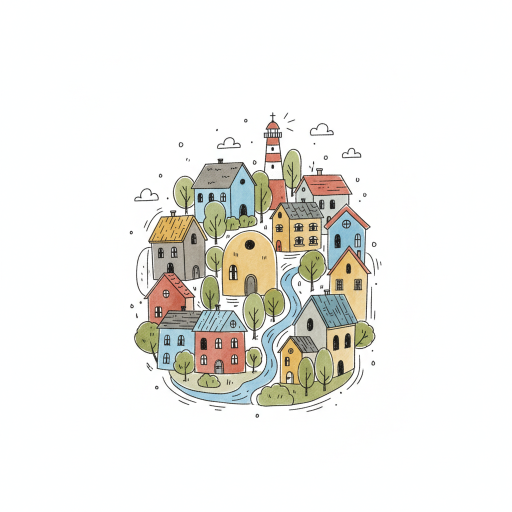 Bunte, gezeichnete Stadt mit Häusern, Leuchtturm, Bäumen und Fluss in Kreisform.
