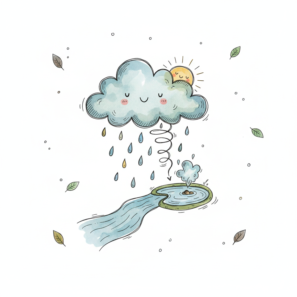 Süße Wolke regnet in einen Teich, der einen Fluss speist, mit Sonne und fallenden Blättern.