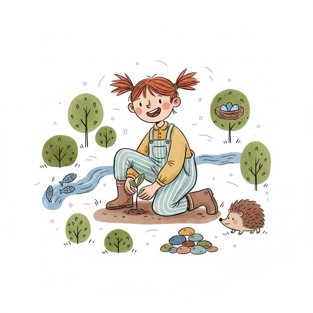 Fröhliches Mädchen pflanzt Baum in grüner Landschaft mit Fluss, Igel und Vögeln.