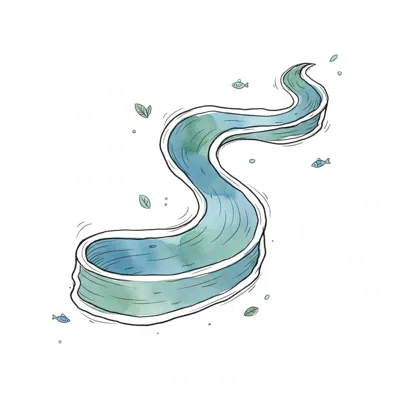 Illustration eines gewundenen Flusses im Aquarellstil mit Fischen und Blättern auf weißem Grund.