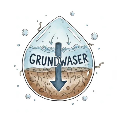 Illustration des Grundwasserflusses: Wasser sickert durch die Erde in einem Tropfen, mit Pfeil und Schriftzug.