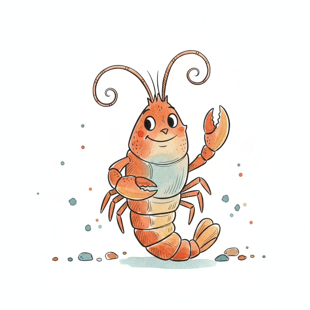 Ein gezeichneter Hummer mit großen Scheren und langen Antennen.