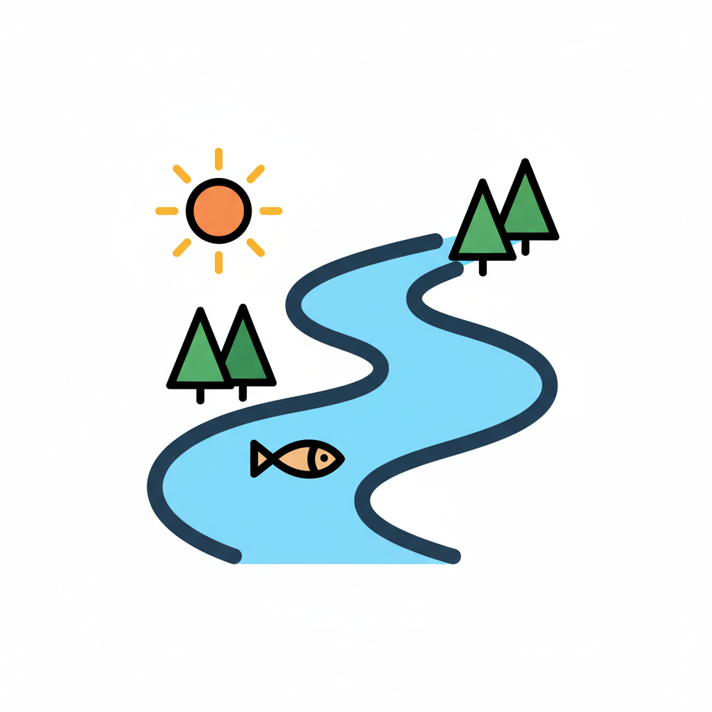Buntes Icon einer Flusslandschaft mit Sonne, Bäumen und einem Fisch im Wasser.