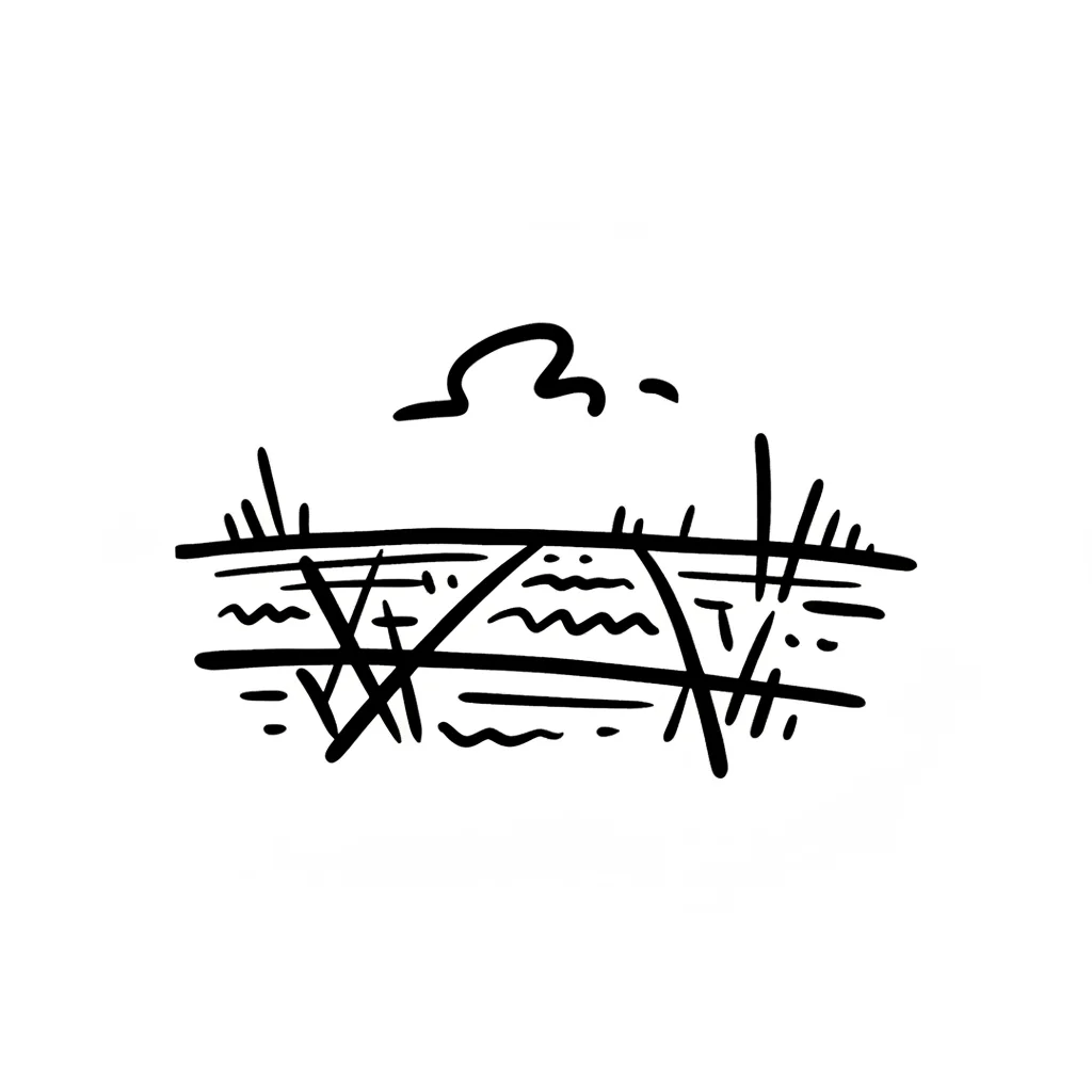 Minimalistische Schwarz-Weiß-Zeichnung einer Flusslandschaft mit Schilf und Wolken.