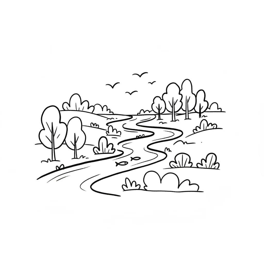 Cartoon-Flusslandschaft mit Bäumen, Büschen, Vögeln und Fischen in Schwarz-Weiß.