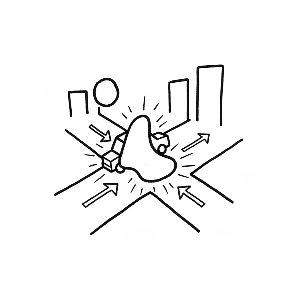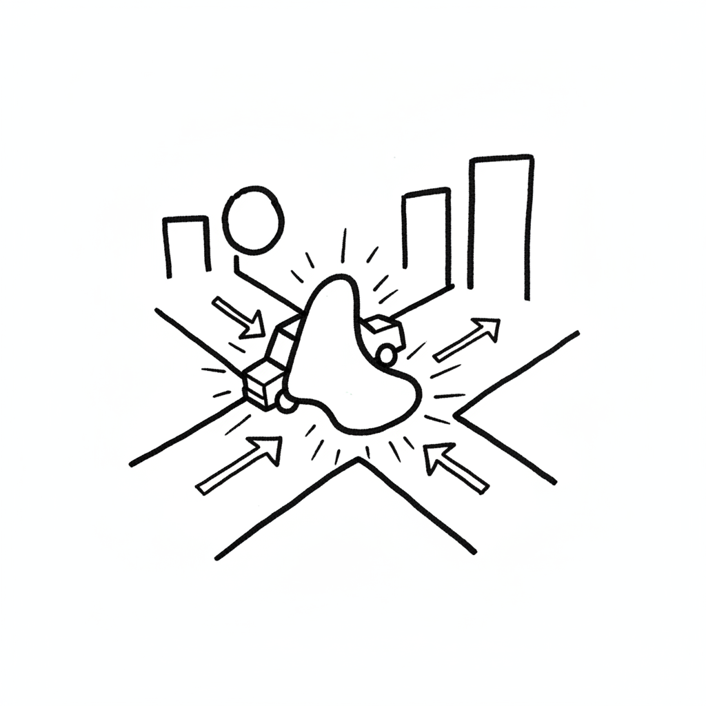 Stilisierte Kreuzung in der Stadt mit Verkehr, Gebäuden und einem zentralen, leuchtenden Fokuspunkt.