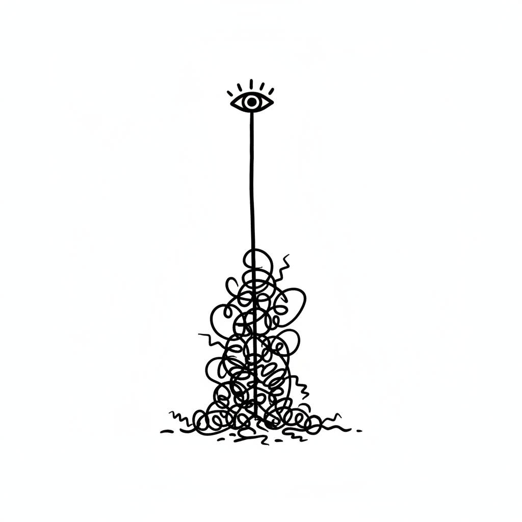 Ein klares Auge blickt über ein Gewirr aus chaotischen, verworrenen Linien.