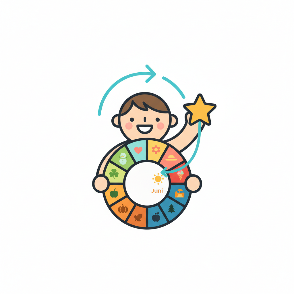 Cartoonfigur mit Jahreszeitenrad, das Monate und Symbole zeigt, mit Fokus auf Juni und einem Stern.