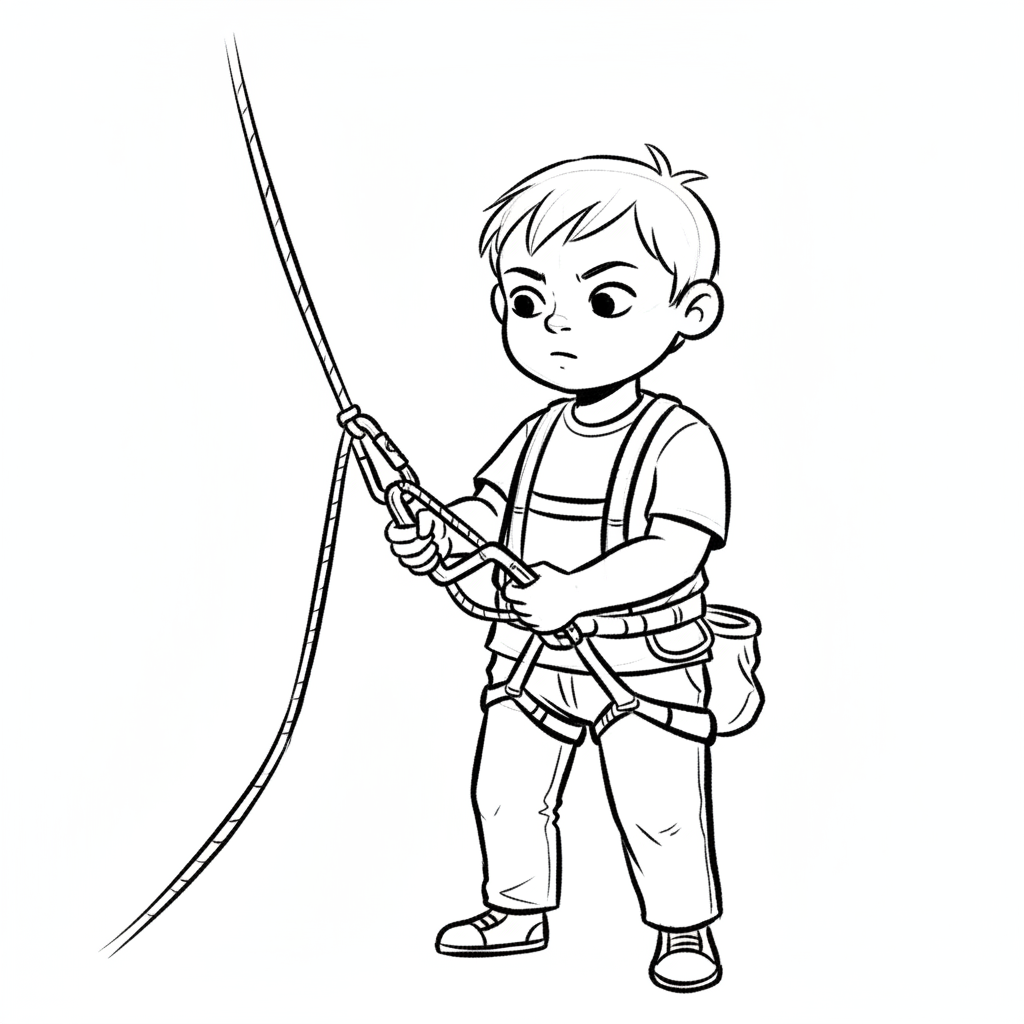 Schwarz-weiß-Zeichnung eines Jungen in Kletterausrüstung, der ein Seil hält und fokussiert schaut.