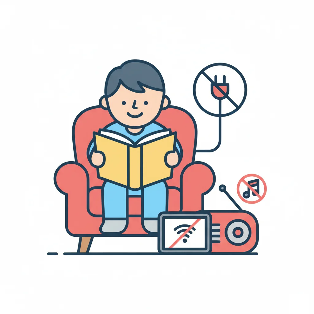 Person liest Buch im Sessel, umgeben von ausgeschalteter Technik. Fokus auf Offline-Entspannung.