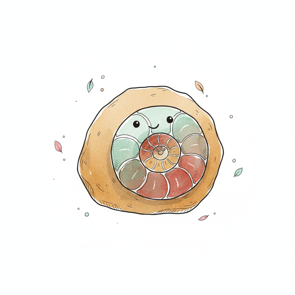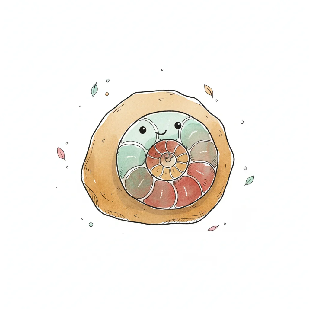 Niedliches, lächelndes Ammonitenfossil in Aquarell-Cartoon-Stil mit bunten Spiralen.