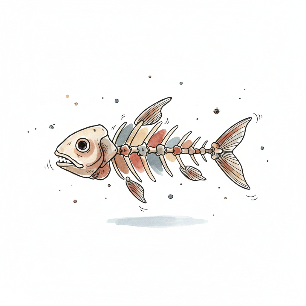 Buntes Fischskelett-Illustration, das mit kleinen Partikeln im Wasser schwebt.