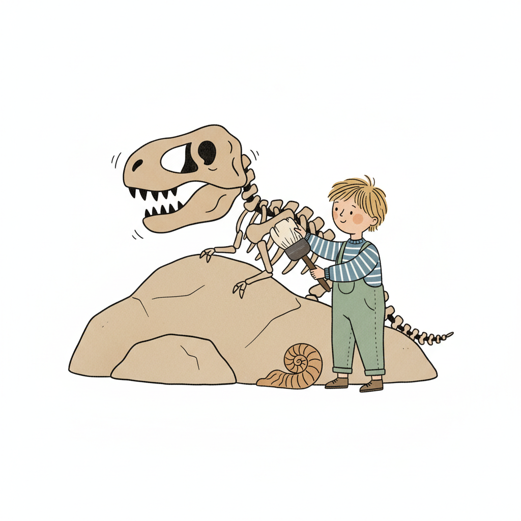 Ein Junge bürstet ein Dinosaurierskelett aus einem Felsen, daneben ein Ammonit.