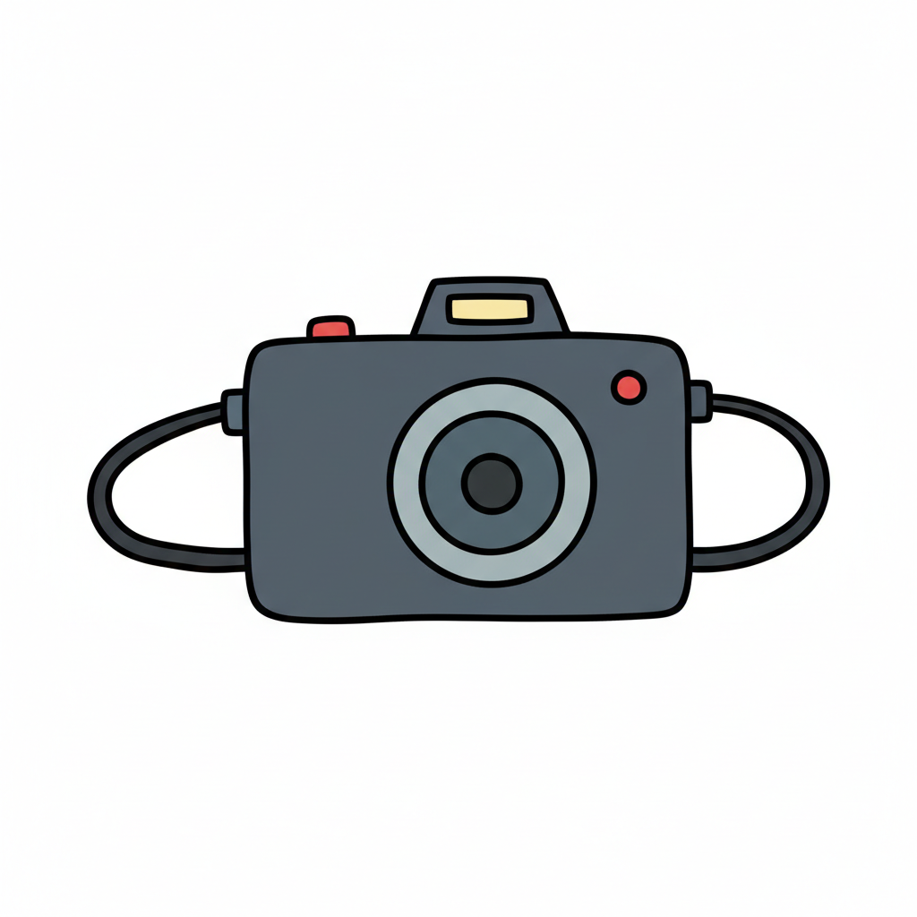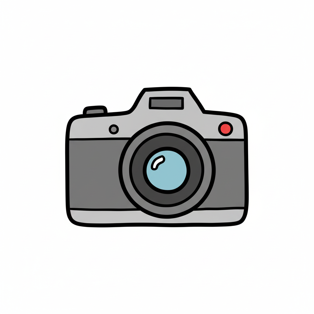 Eine einfache, graue Cartoon-Kamera mit schwarzem Objektiv und rotem Knopf auf weißem Hintergrund.