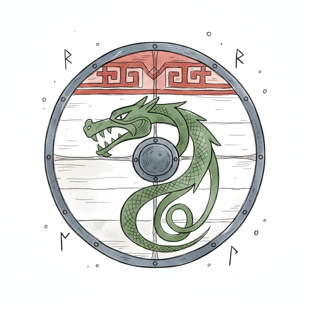 Runder Wikingerschild mit einem grünen Drachenmotiv, Holzstruktur und Runen am Rand.
