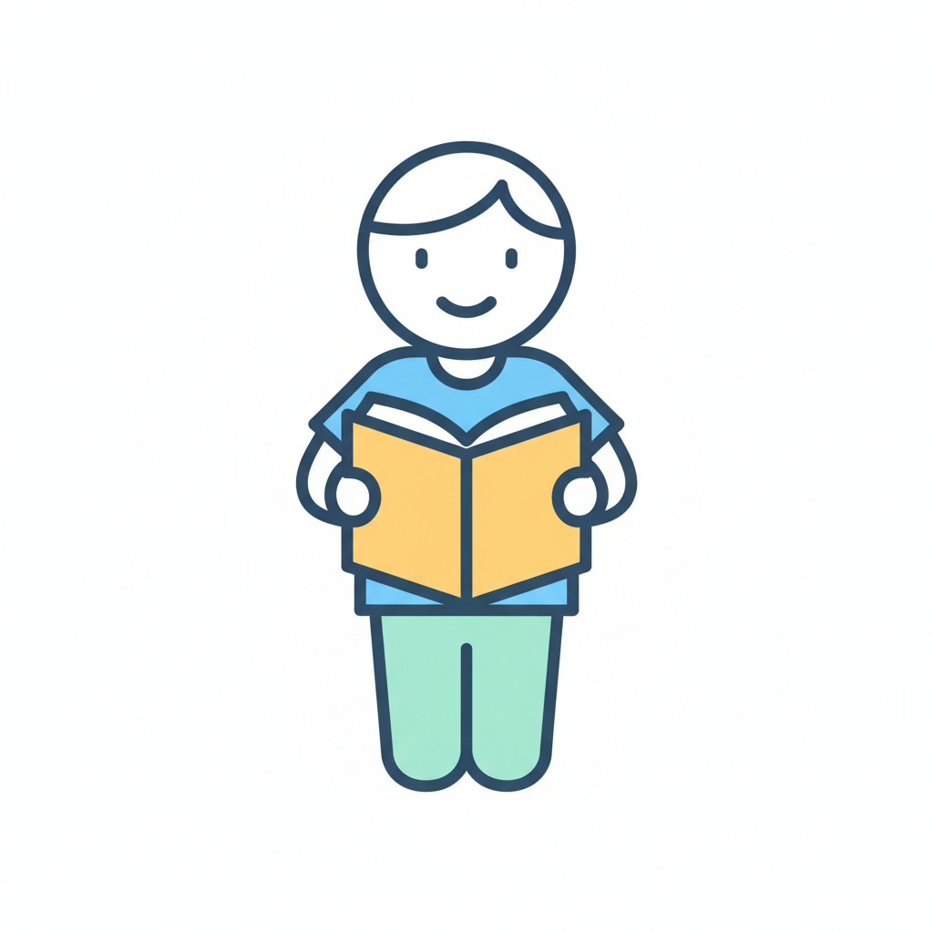 Stilisierte Illustration eines lächelnden Kindes, das ein offenes Buch liest.
