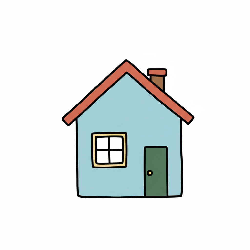Einfache, gezeichnete blaue Haus-Illustration mit rotem Dach, grünem Tür und Fenster.