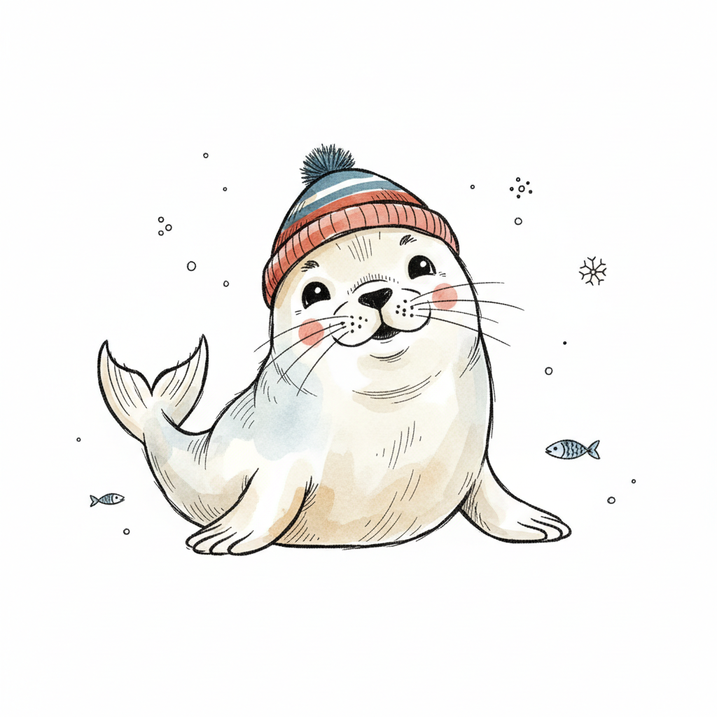 Niedliche Robbe mit gestreifter Wintermütze, lächelnd in Aquarell-Optik.