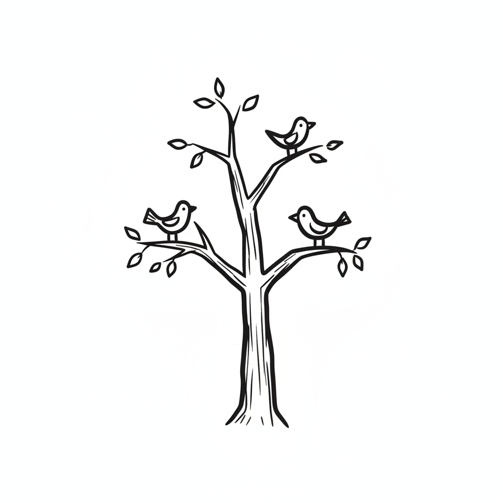 Schwarz-weiße Strichzeichnung eines Baumes mit drei Vögeln auf den Ästen.
