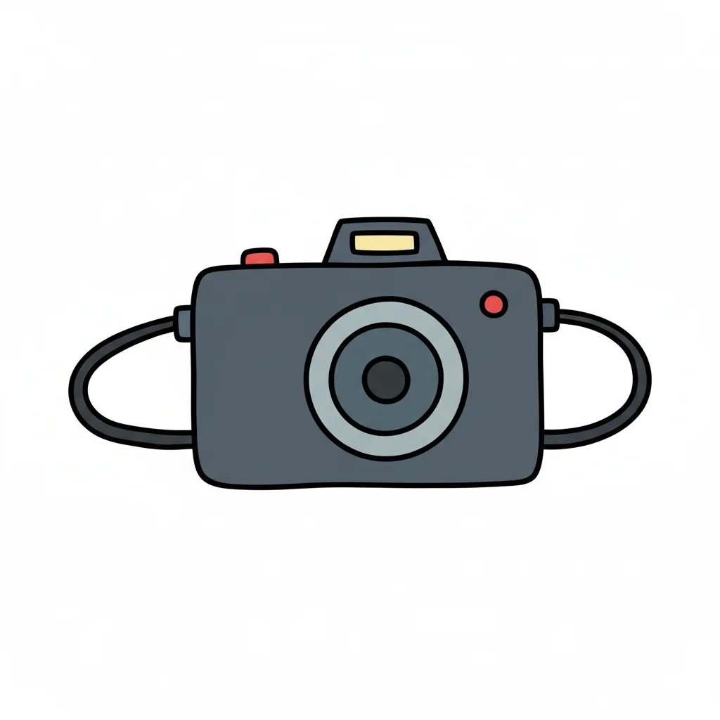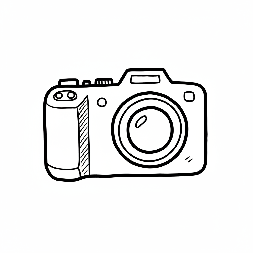 Schwarz-weiße Doodle-Zeichnung einer Kamera mit Objektiv und Tasten.