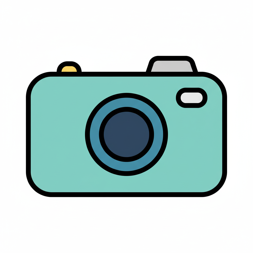 Minimalistische Illustration einer türkisfarbenen Kamera mit dunklem Objektiv und farbigen Knöpfen.