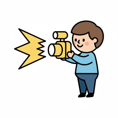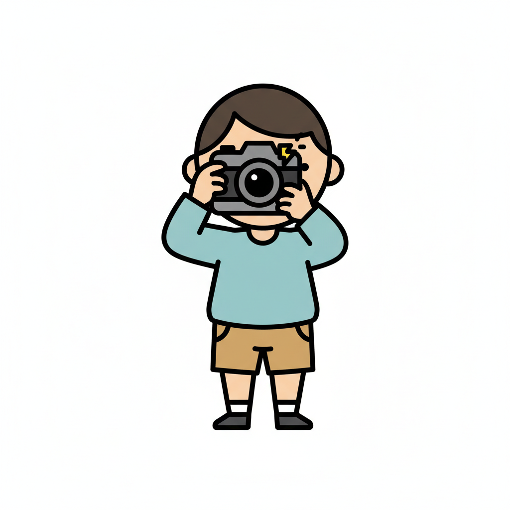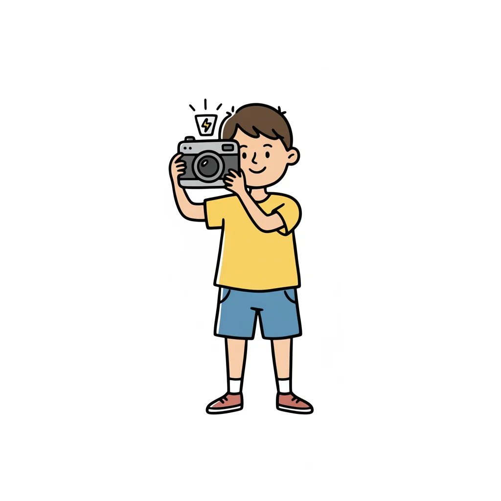 Ein Cartoon-Junge macht ein Foto mit einer Kamera, wobei der Blitz aufleuchtet.