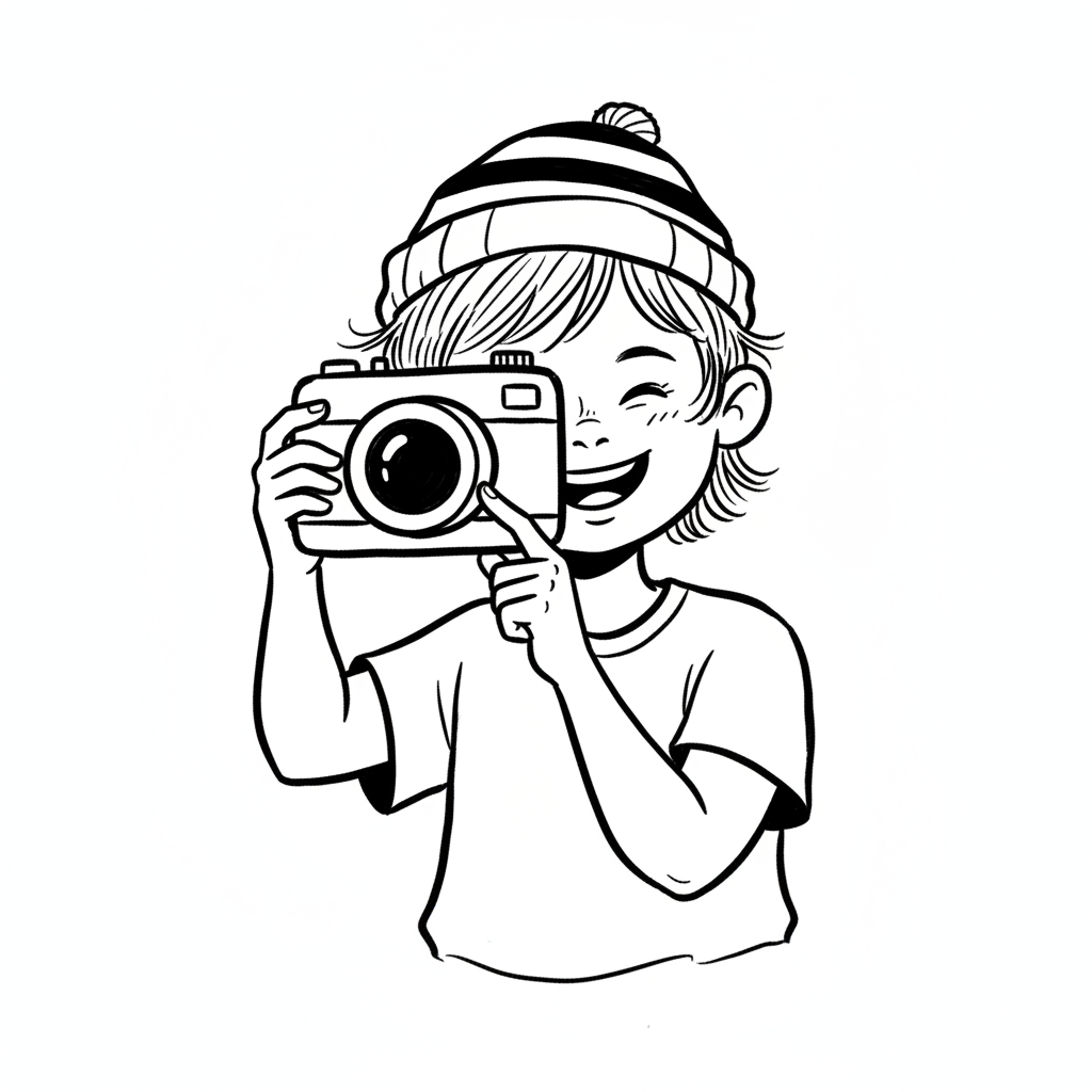 Schwarz-weiße Illustration eines lächelnden Kindes mit Mütze, das eine Kamera hält.
