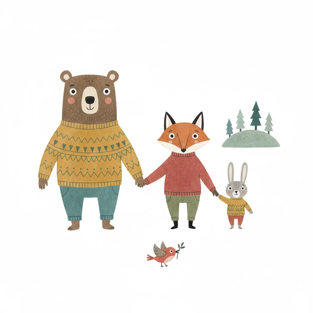 Niedliche Illustration von Bär, Fuchs und Hase, die Händchen halten, mit Vogel und Bäumen.